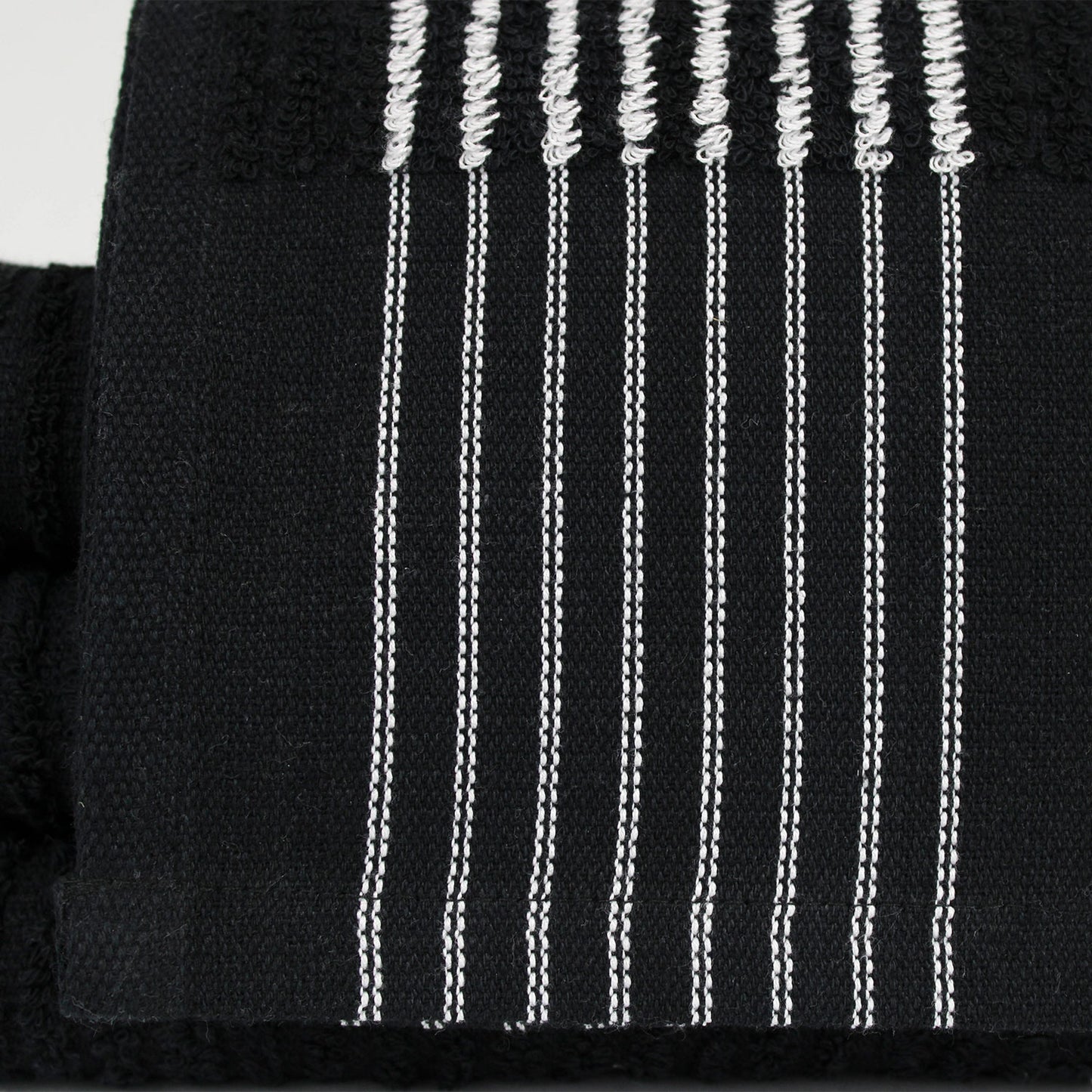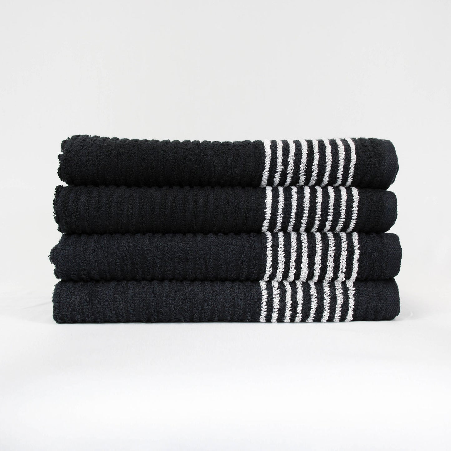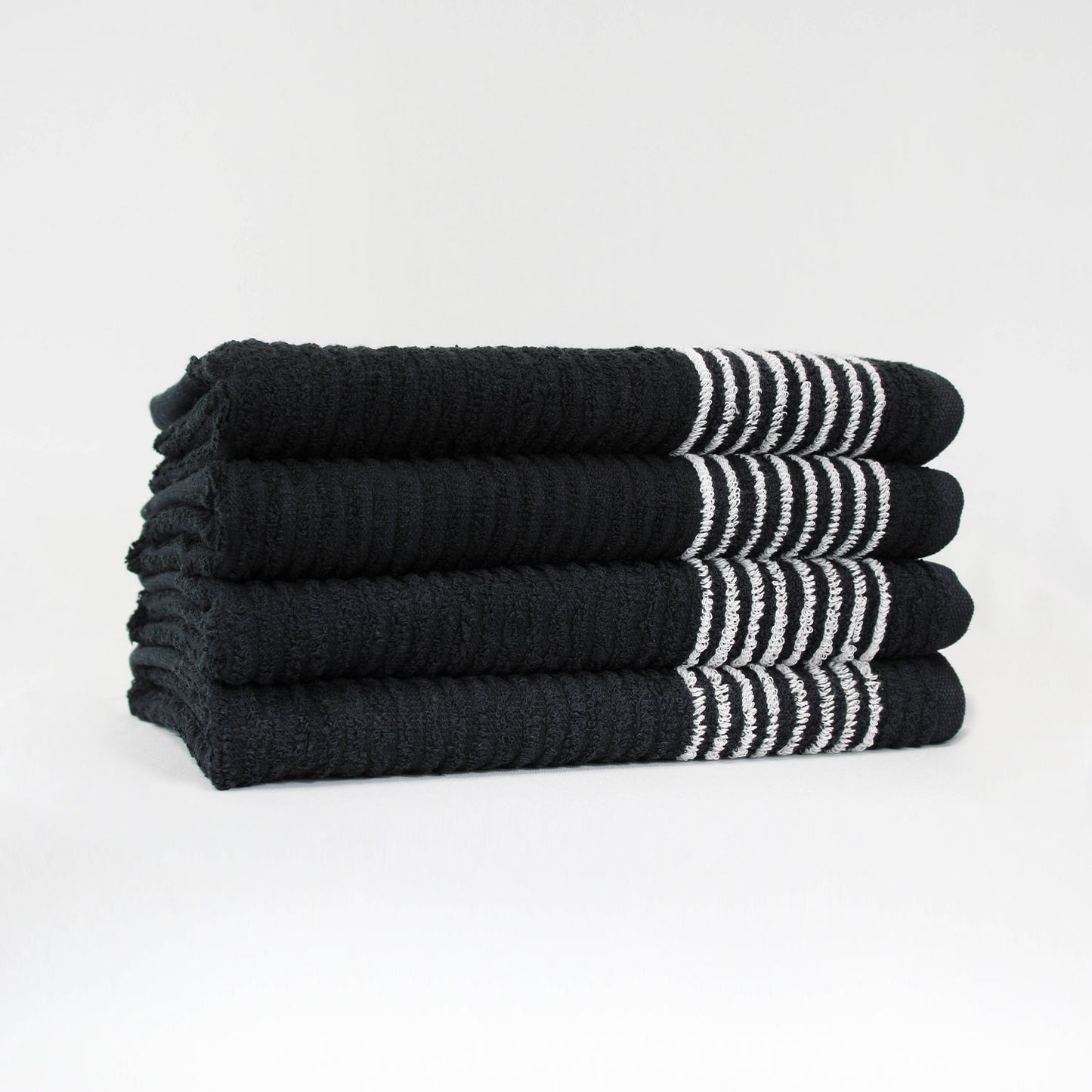 Our ribbed black gym towels with white stripes are perfect for easy identification within your facility. Widely used as caddie towels, they are also ideal for small shower towels or large bench towels. Available in a 22" x 44" size, made with 16 single ringspun yarn for exceptional softness and durability.